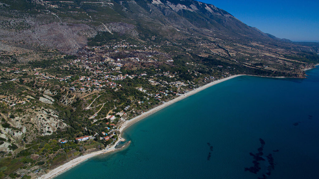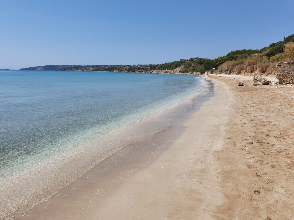 A tranquil sandy beach with crystal-clear waters, perfect for families and relaxation, with nearby tavernas serving traditional local dishes.